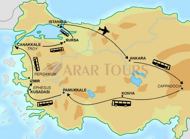 Café da manhã e saída até Pergamo, importante centro cultural e médico da antiguidade. Visita a Asclepion, antigo centro terapêutico dedicado a Esculapio, Deus da Medicina. Depois do almoço continuação da viagem até a cidade lendaria de Troia, imortalizada por Homero e visita das ruínas. Chegada ao hotel, jantar e hospedagem.