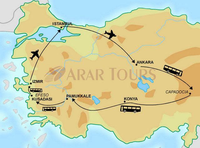 Café da manhã e visita a cidade antiga de Hierápolis com sua imensa necrópole, uma das mais interessantes e ricas da Ásia Menor. Saída até Kusadasi. Chegada e visita de Efeso, uma das cidades mais grandiosas e melhor conservada da Antiguidade. Visitaremos o Odeon, o Templo de Adriano, os famosos banhos romanos, a Biblioteca de Celso, o famoso Teatro e etc. Continuaremos visitando a Casa da Virgem Maria, lugar de destaque da peregrinação. Almoço em Selcuk e visita a um ateliê de produtos de couro. Traslado ao aeroporto de Izmir e vôo com destino a Istambul. Chegada e traslado ao Hotel.