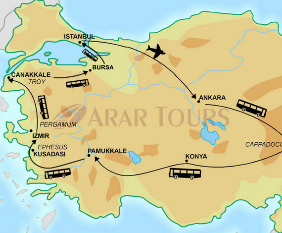 Desayuno y salida hacia Pérgamo, importante centro cultural y médico de la Antigüedad. Se realizará la visita del Asclepión, antiguo centro terapéutico dedicado a Esculapio, dios de la Medicina. Después del almuerzo continuación del viaje hacia la ciudad legendaria de Troya, inmortalizada por Homero. Visita de las ruinas. Llegada al hotel. Cena y alojamiento.